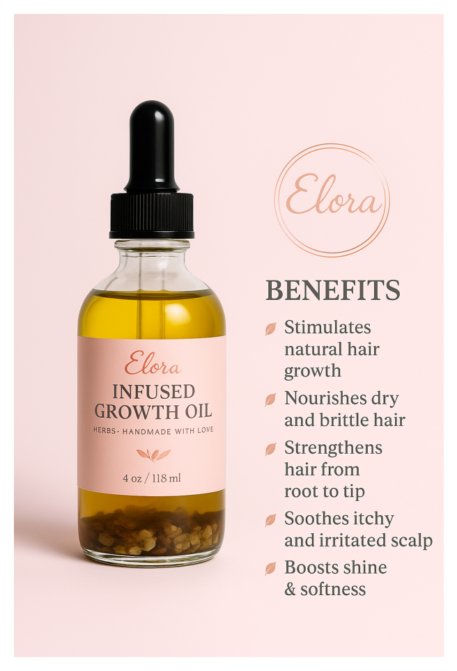 šæ Elora Infused Growth Oil is a handmade herbal blend formulated to nourish and stimulate hair growth. Infused with natural ingredients like fenugreek, rosemary, hibiscus petals, and castor oil, this luxurious oil helps restore shine, moisture, and strength from root to tip. Perfect for dry, itchy scalps and brittle hair.